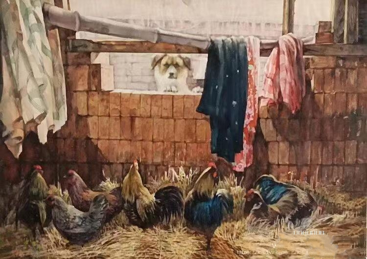 名家访谈摘要: 水彩画《窥》是李国维二十年前在保定乡村采风时的灵感结晶,描绘了一只小狗扒窗窥探的生动瞬间。作品通过精巧构图将斑驳土墙、悠闲鸡群、晾晒衣物等元素有机融合,运用水彩特有的透明质感呈现春日午后...
